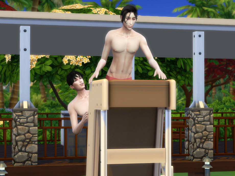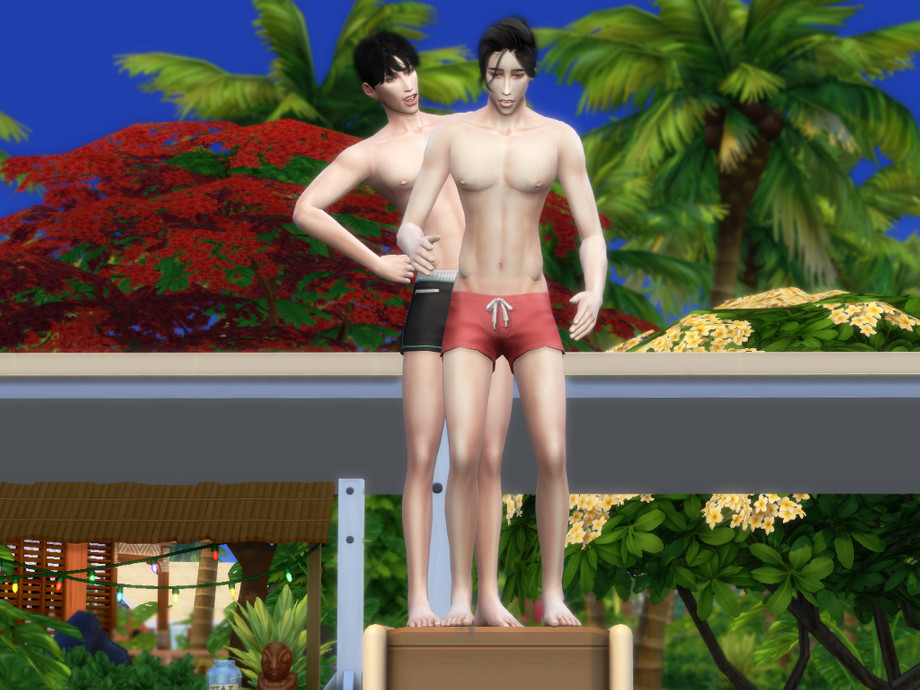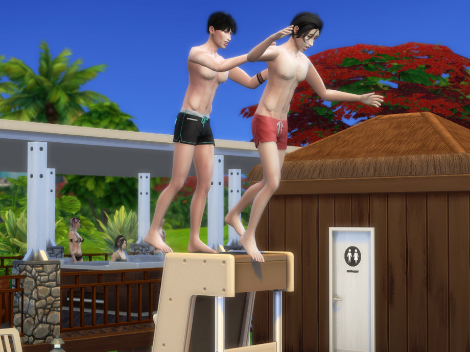 You just put teleporter in the middle of the ladder (see the picture) your sim is gonna fall into pool (which is okay), just click on your sim and use the pose and voila!