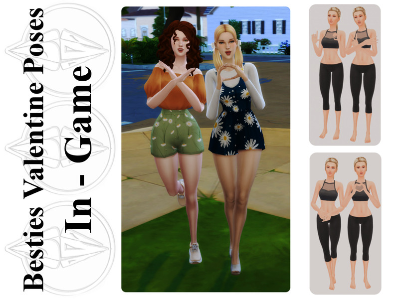 For In-Game Poses, buy the teleport statue and stack two (on top of each other) where you want your sims to teleport. Click the statues one at a time and select your sims, then select a pose. The sims will appear in place of the statues. Then click on your sims and pose by pack. Choose the pose pack called "Besties Valentine Pose Pack".