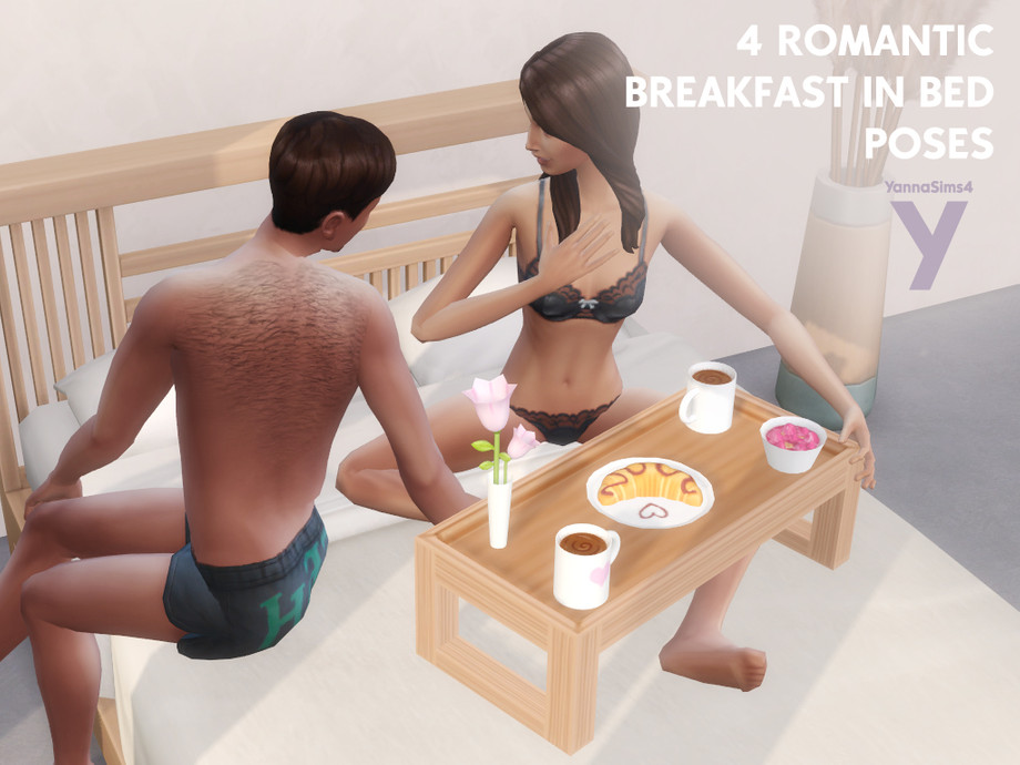 My pose pack comes with in-game instructions of where to place your Sims via the Teleport Mod (in this case, the middle of a bed) and has thumbnails of the breakfast in bed tray, so you can easily spot the pack if you have lots of poses.