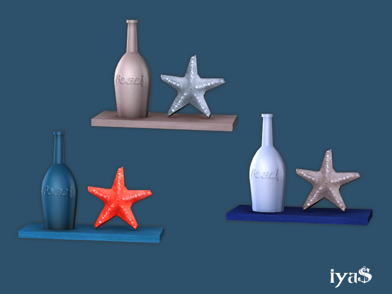 Small shelf with vacation souvenirs, comes in two styles: one with a bottle and starfishes, another with a jug and a single starfish. 3 variants. Category Decoration - Wall Sculpture. Part of Seaside decor set.