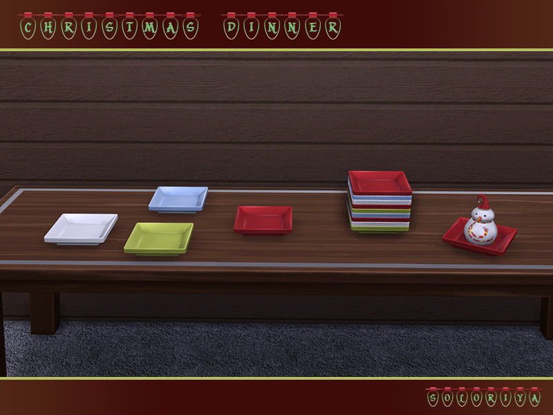 Three square decorative plates. STACKABLE - has 1 slot for a small decorative item. Part of Christmas Dinner set. color variations. Category: Decorative - Clutter.