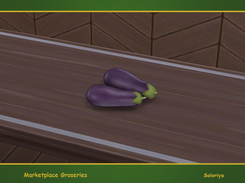 Two decorative eggplants in one mesh. Part of Marketplace Groceries. 1 color variation. Cagetory: Decorative - Clutter.