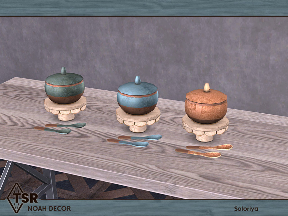 Pot on a tray with spoons. Part of Noah Decor set. 3 color variations. Category: Decorative - Clutter.