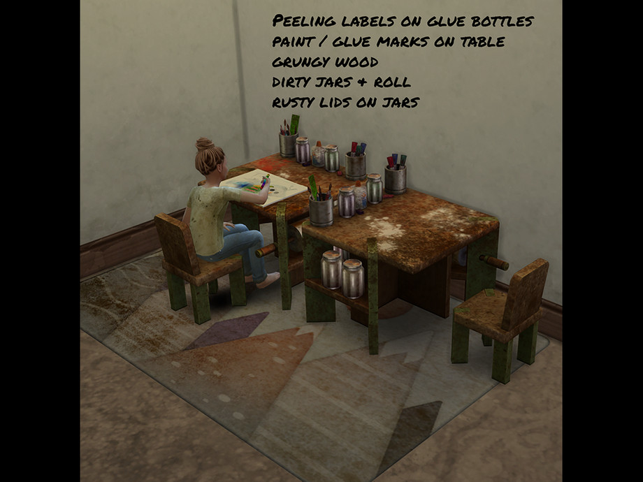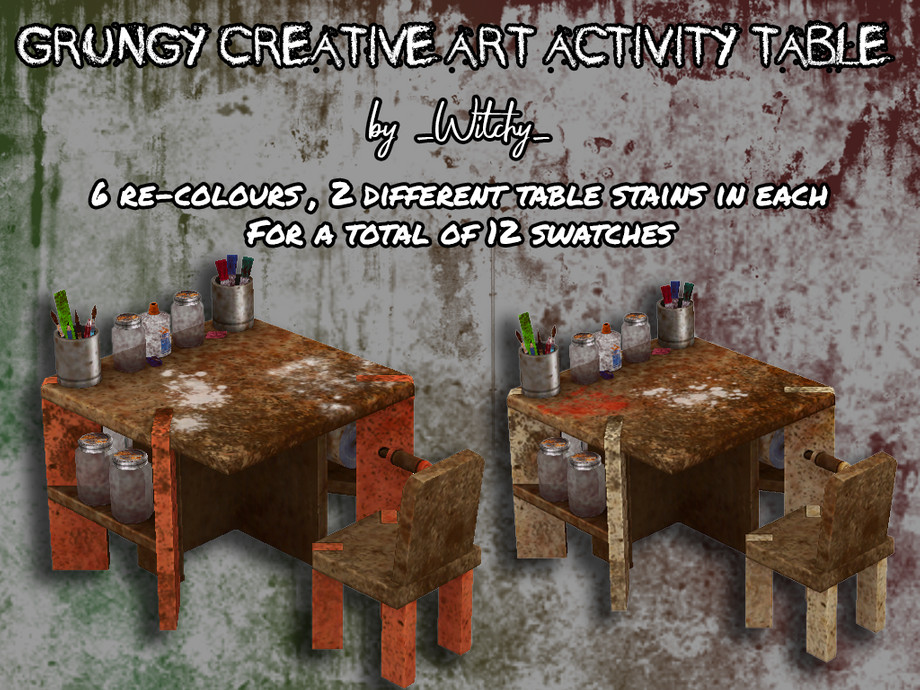The creative art thou crafting table has been grunged up , it comes in a grungy version of all 6 original colours , with 2 different table surfaces, for a total of 12 swatches. The 2 different table surfaces, mean you can put 2 crafting tables together in a community lot (or home!) and they WON'T have identical stains, but WILL colour match.
