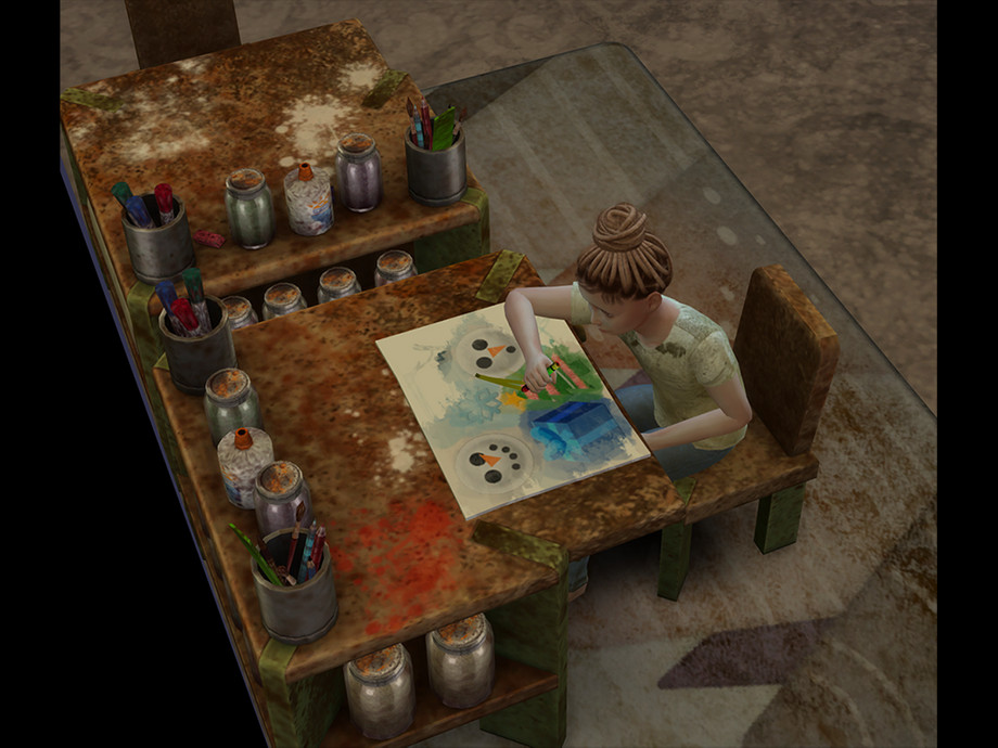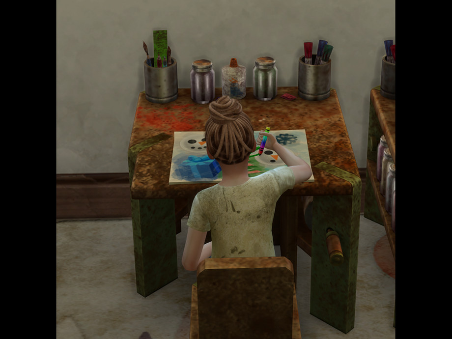 A grungy secondhand crafting table , great for your rags to riches sims , or for social lots like community centres.