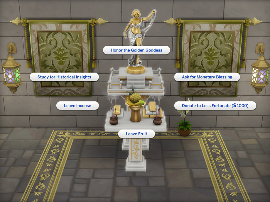 2) Ask for Monetary Blessing: seeing as she is a Prosperity Goddess, your Sim can beg for money, and She will grant them as little as 1 or as much as 250 Simoleons. Sims can take this action once per day.