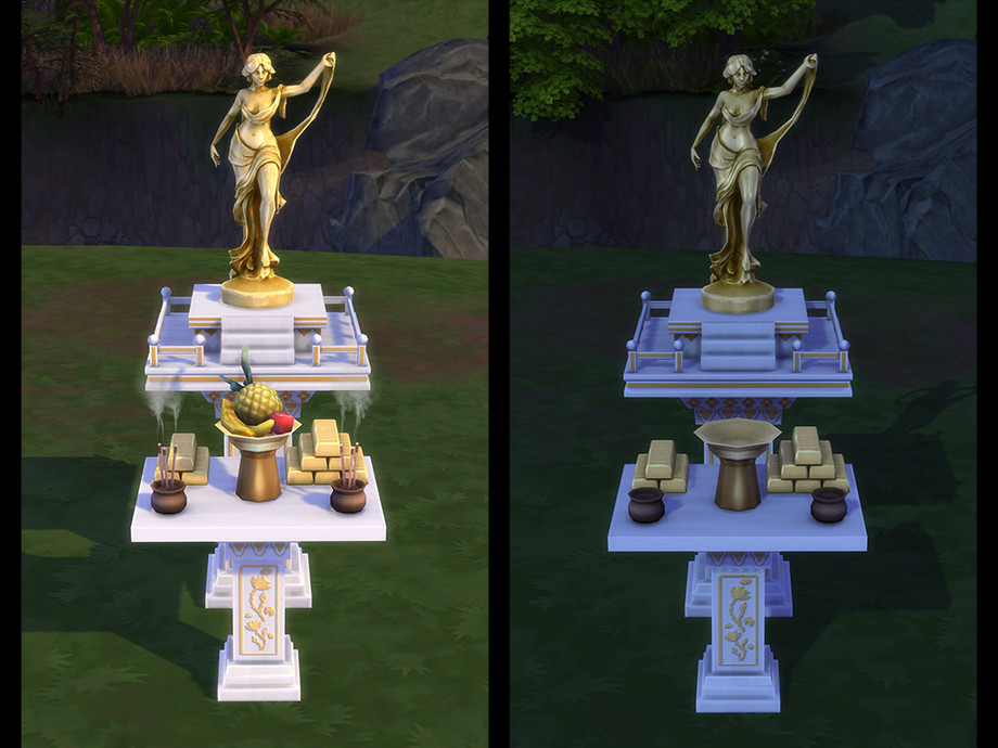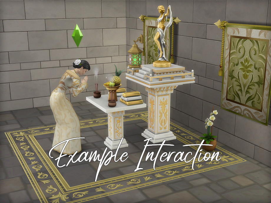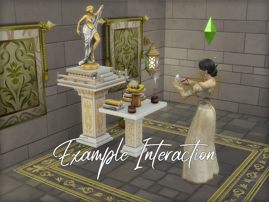 1) Honor the Goddess: your Sim will approach the altar and bow to the Goddess. This yields a custom happy moodlet.