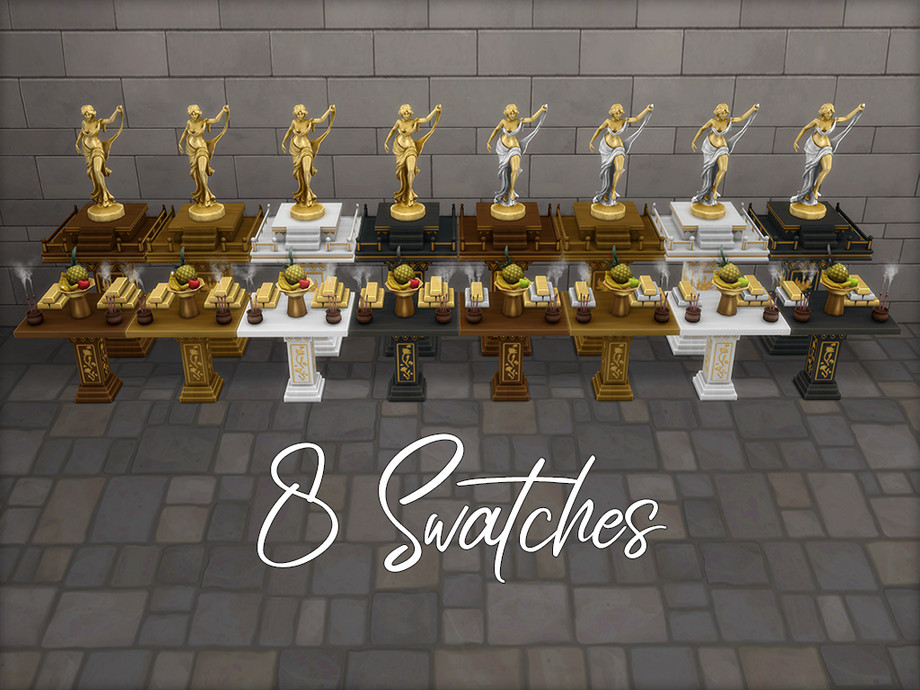 8 swatches, all color-tagged. Cost is 10,000 Simoleons (yes, she is expensive!). Find it in build-buy by searching Goddess or Naunakht.