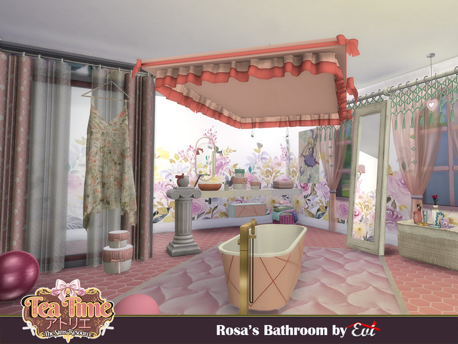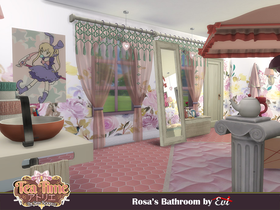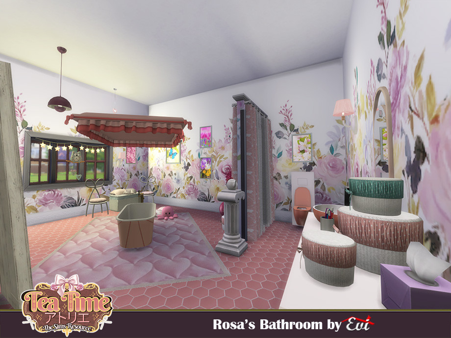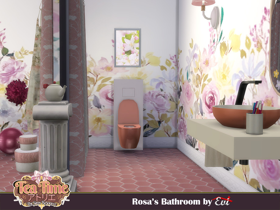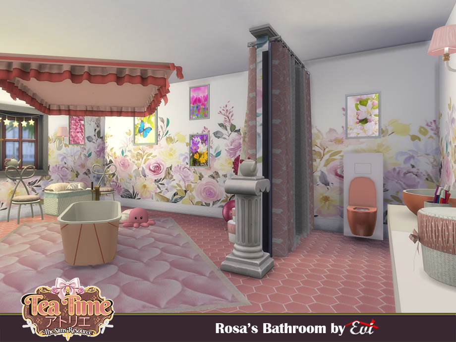 A pink girlish bathroom furnished and decorated with flower walls and pastel colours.