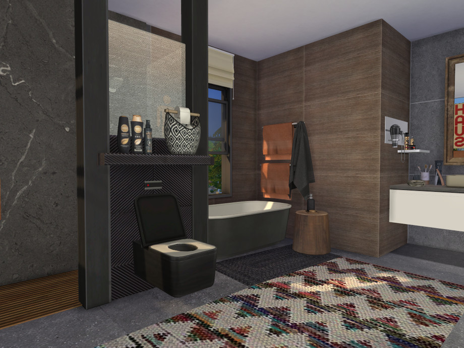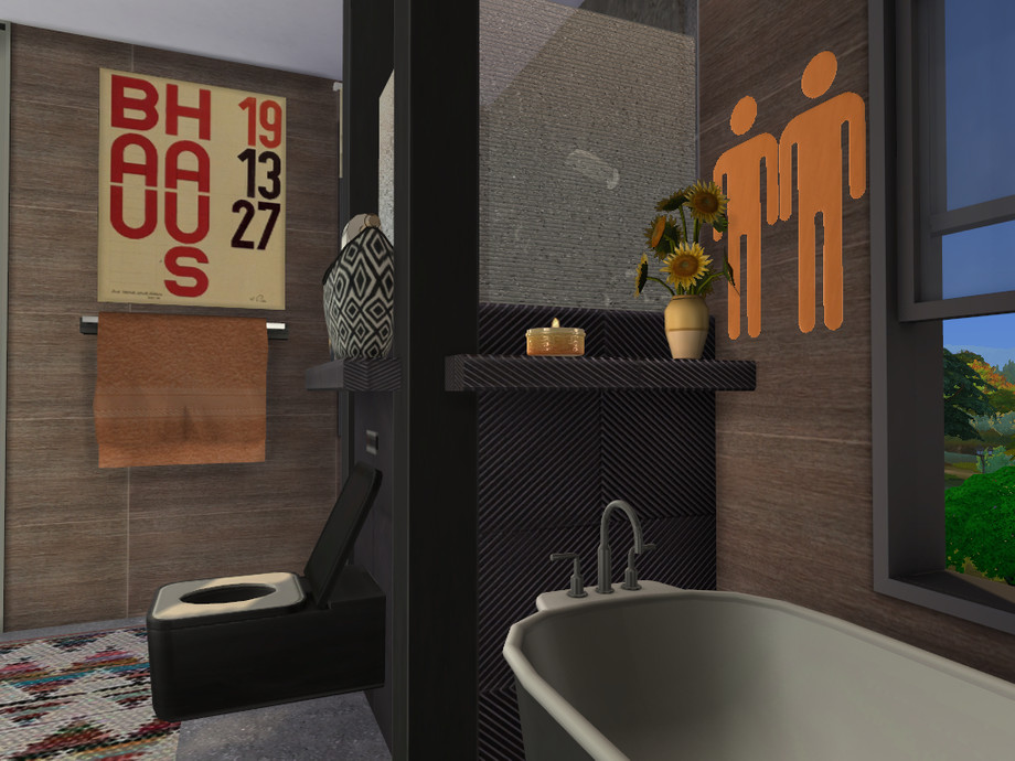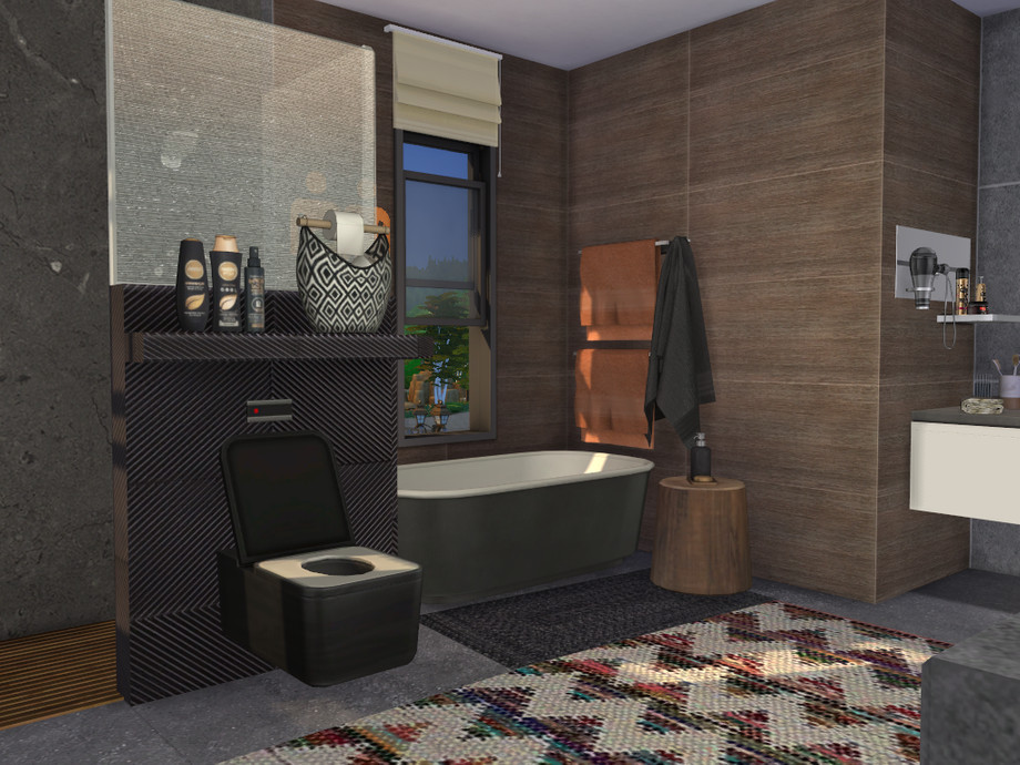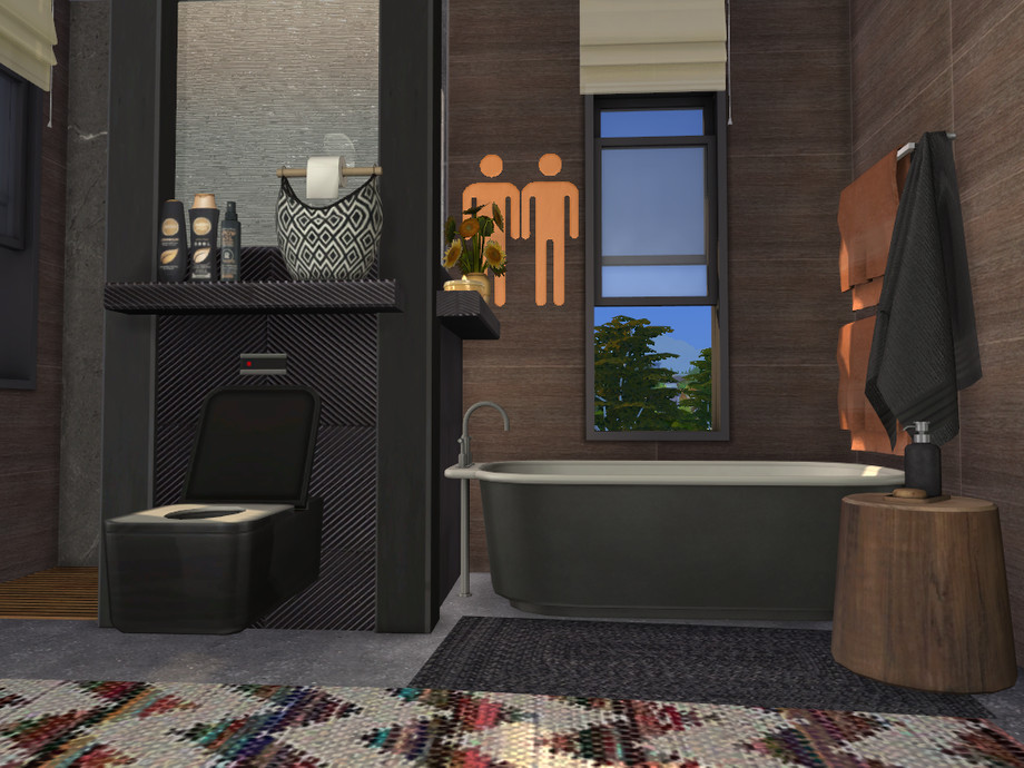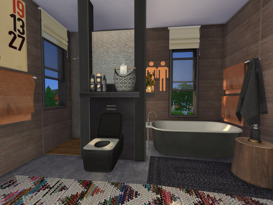 Brent and Brant met each other in front of the church in Brindleton Bay and vowed they would get married there one day... and so they did. It is great to have the view of that church from the tub. It makes them proud! A masculine bathroom in blacks and earth tones. One door leads to their bedroom and the other to the laundry room.