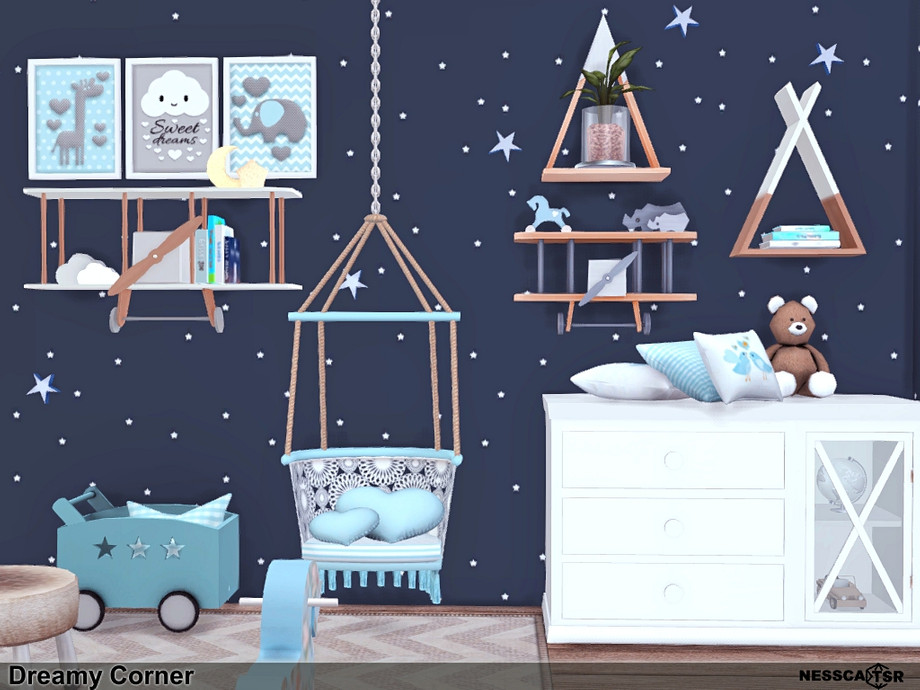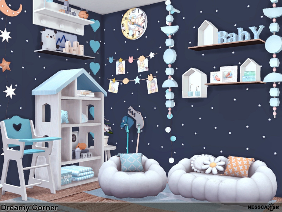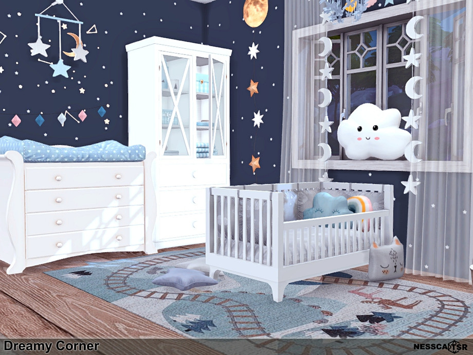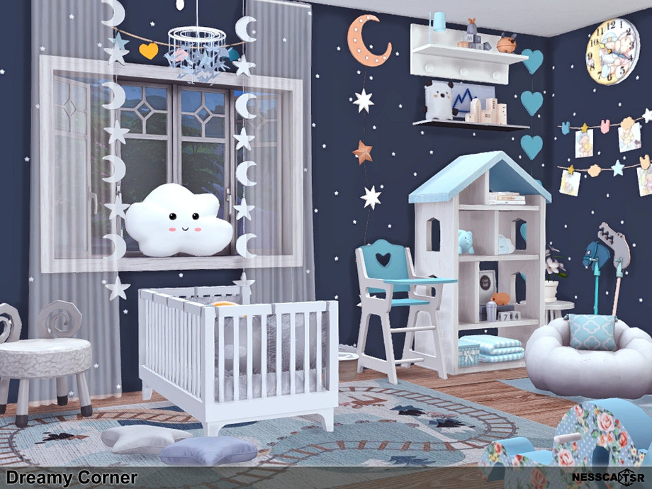Dreamy Corner is a beautiful bedroom for the youngest Sims. The colors in the interior are a combination of: white, navy blue and wood. The wall covering resembles a starry night.