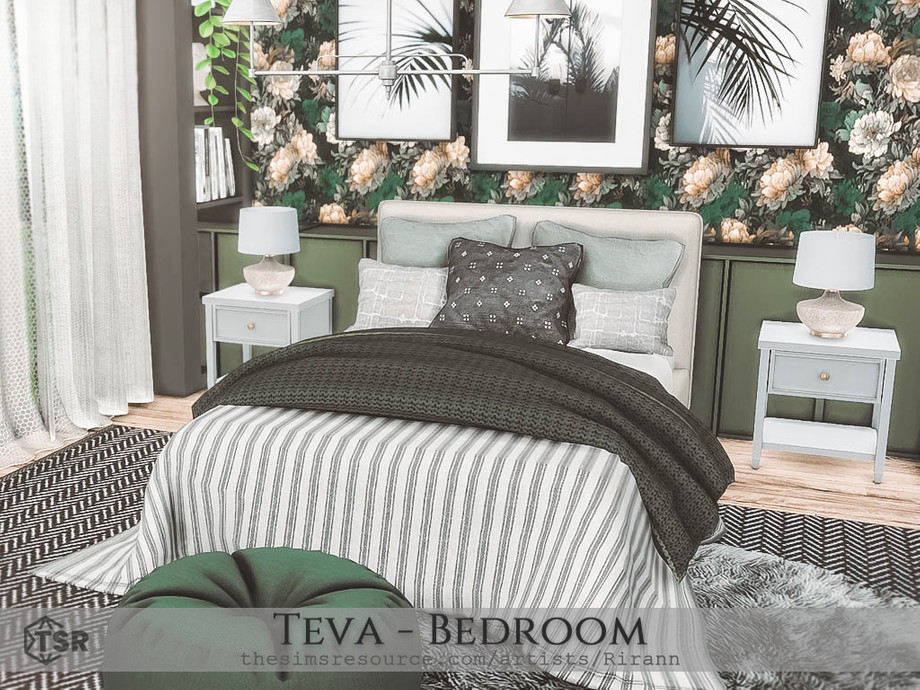 Teva is a cozy bedroom in green, grey, light brown and white colors