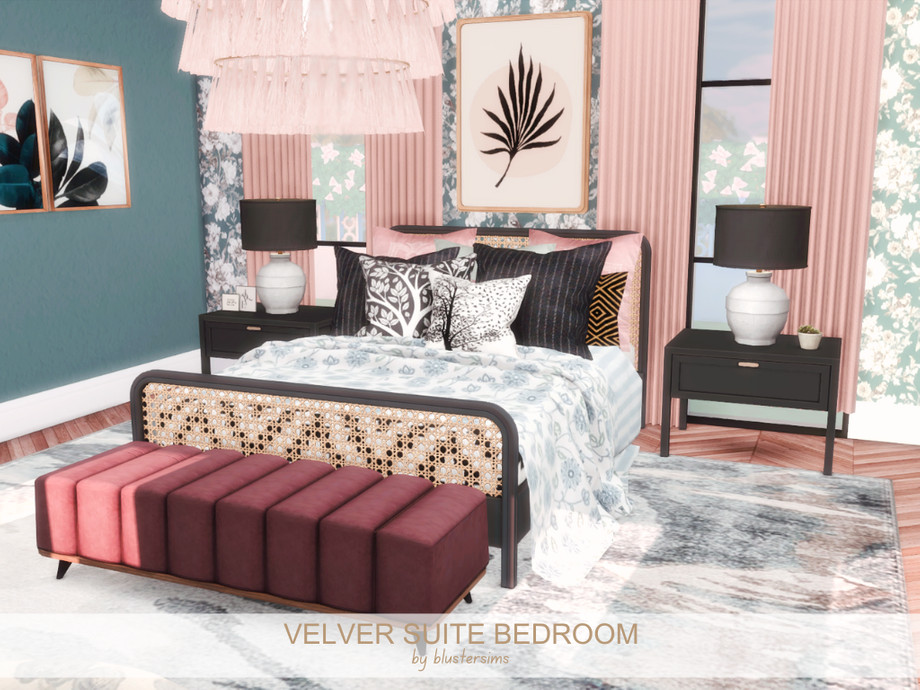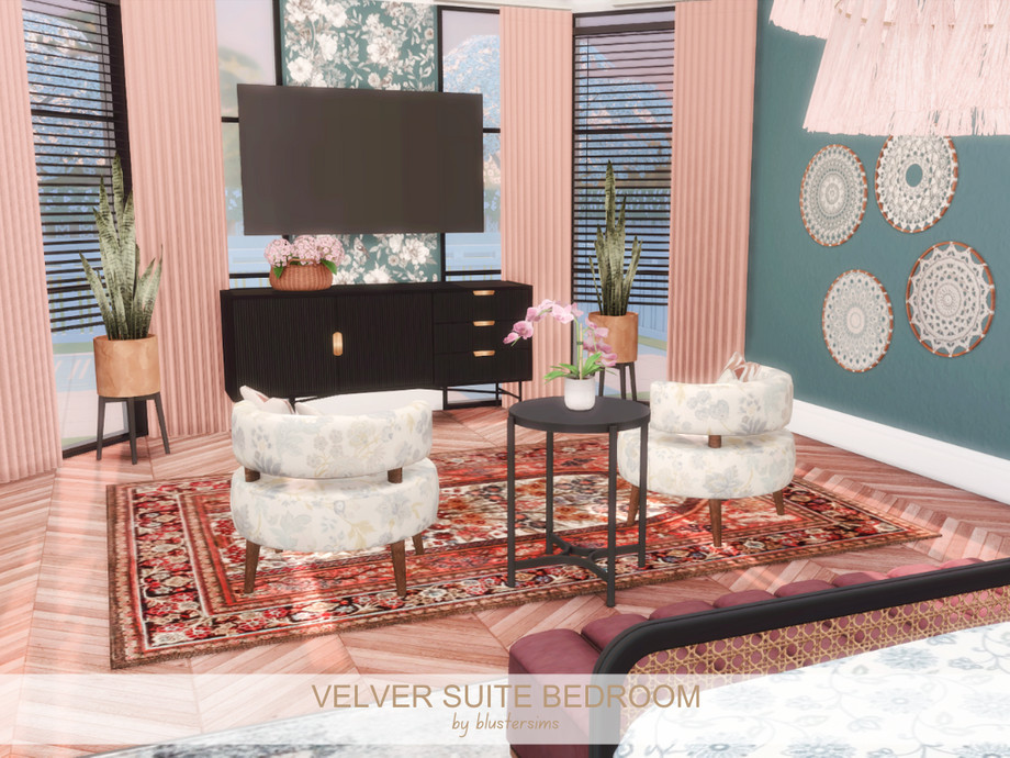 The Velvet Suite Bedroom is a cozy, glam space with blush pink drapes, teal walls, floral accents, and velvet seating, finished with modern black furniture and a statement chandelier.