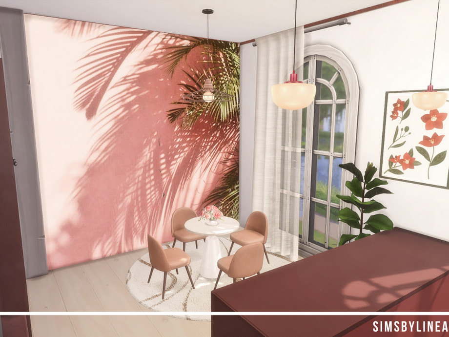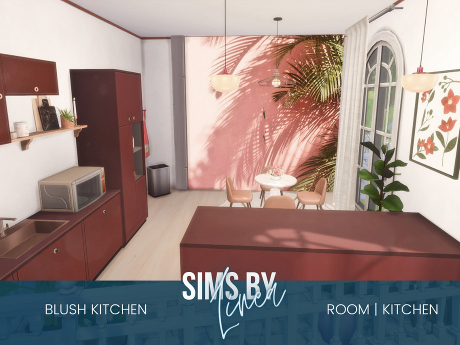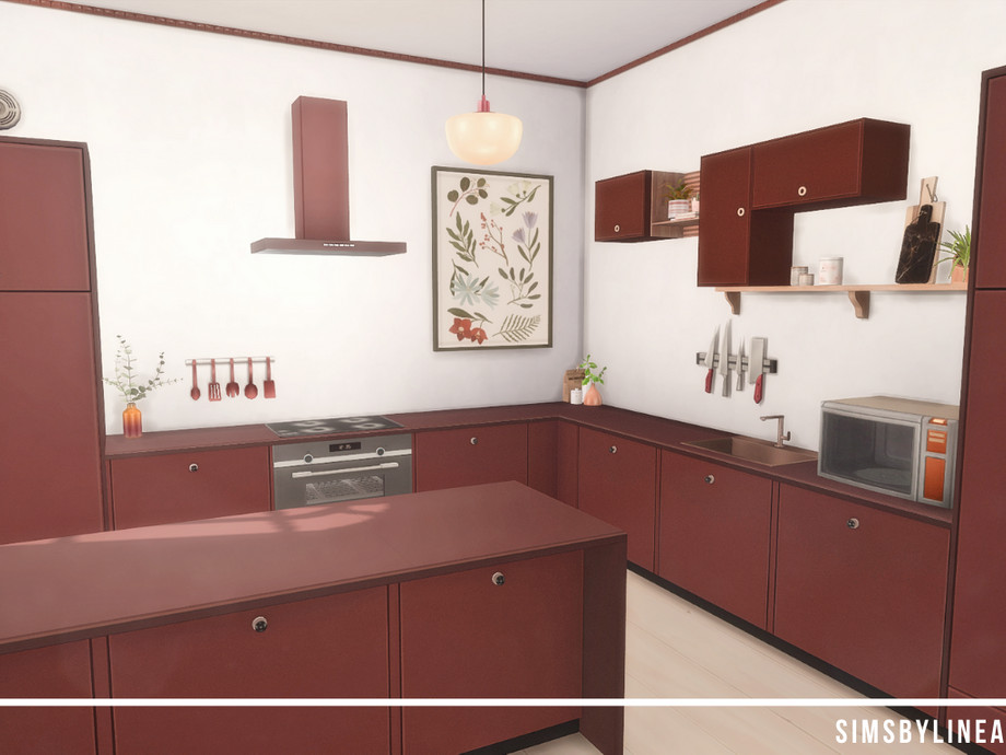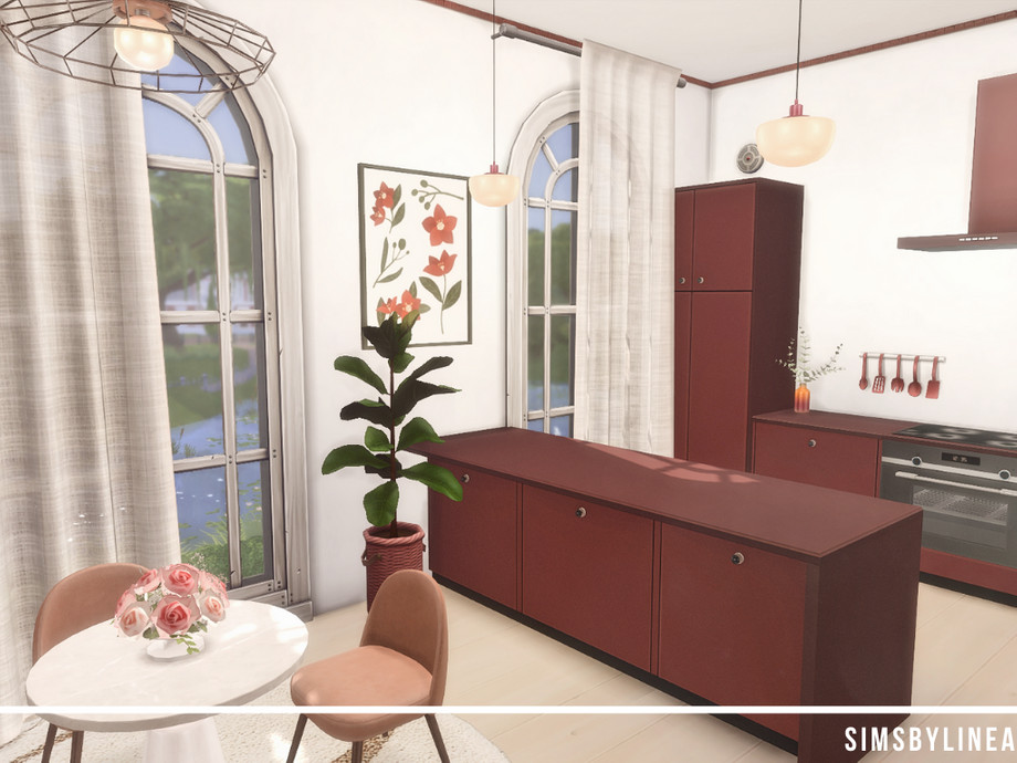 This modern kitchen is a moody mix of modern designs. The dark red kitchen matches the pink and blush accents and is accompanied by some more subtle pieces of decor. This medium size kitchen and dining area are a beautiful room for your family to cook together and have some quality time!