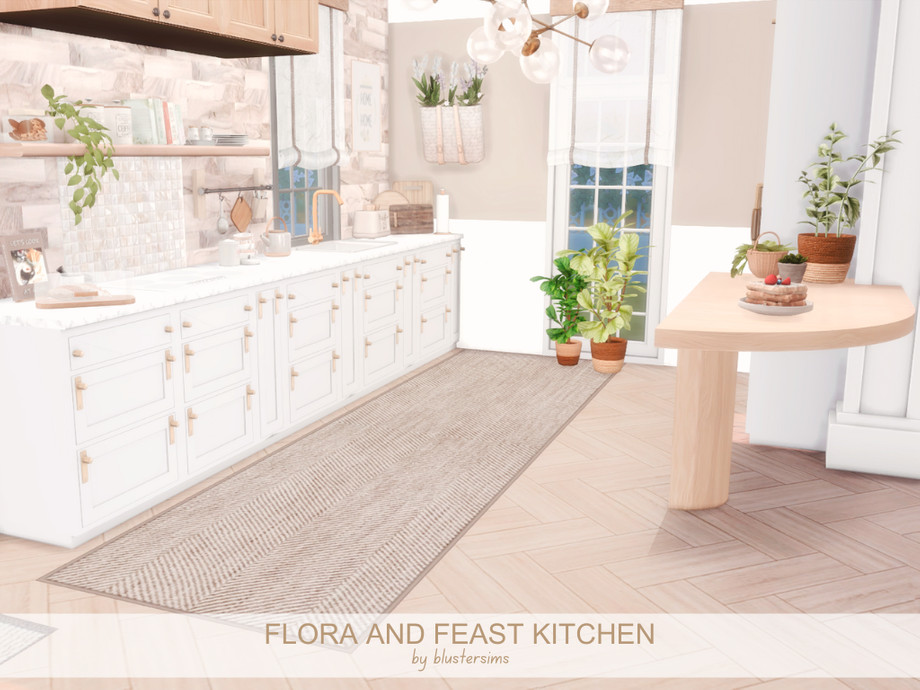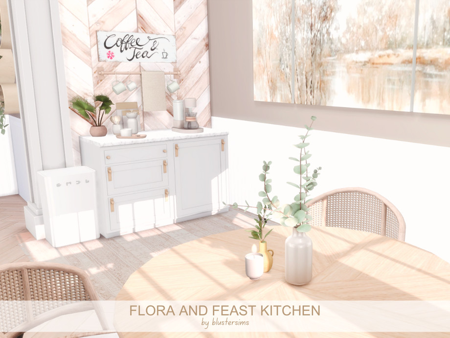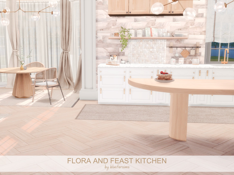 The Flora and Feast Kitchen is a bright, airy space with white cabinetry, warm wood accents, soft neutral textures, and cozy greenery. Perfect for relaxed cooking, coffee, and casual gatherings.