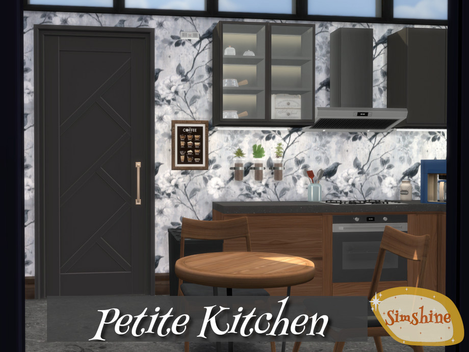 Small kitchen in shades of black, gray, and dark wood. The custom content is TSR only.
