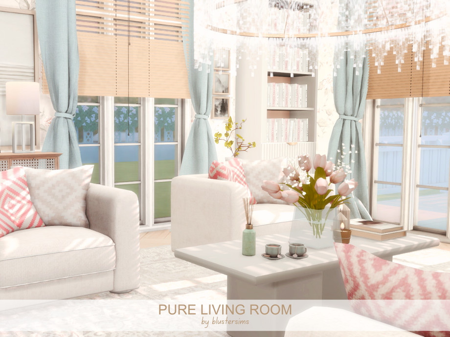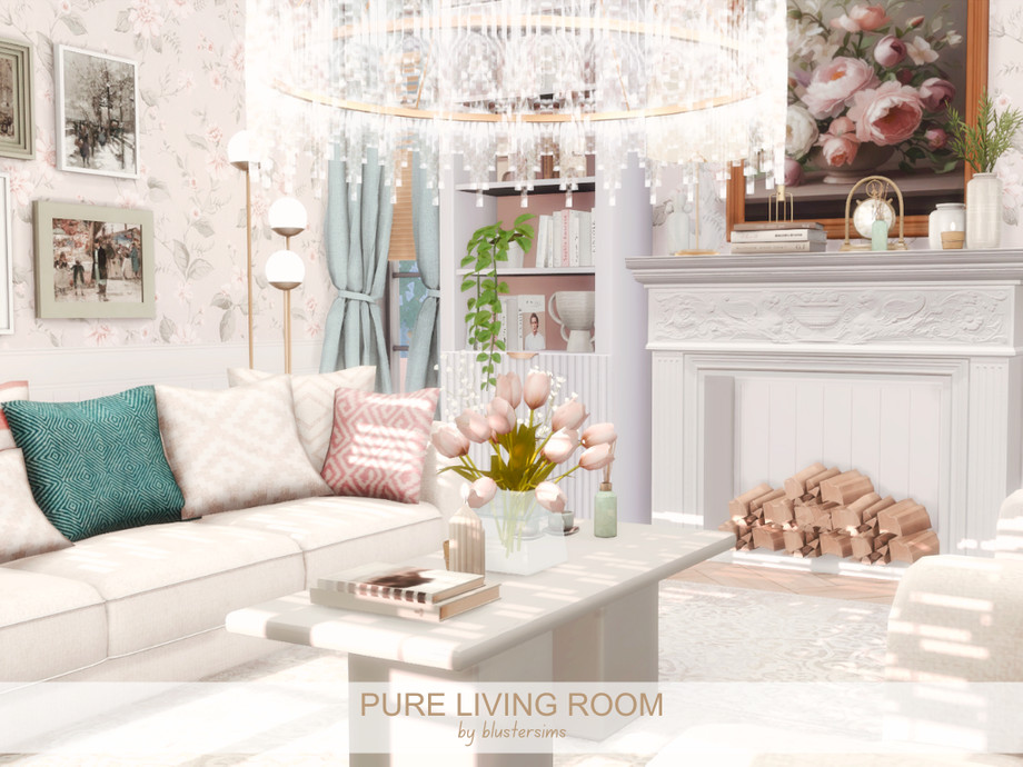 The Pure Living Room is a bright, serene space with soft pastels, cozy cream seating, lush greenery, and elegant details like a chandelier and ornate fireplace, creating a calm and timeless atmosphere.