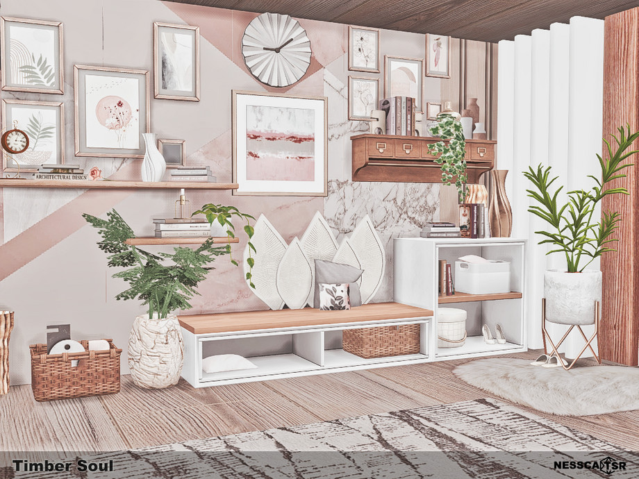 Timber Soul is a charming, bright living room. It features numerous placs to sit and relax for your sims along with a fireplace TV, and bookshelves. Have fun!