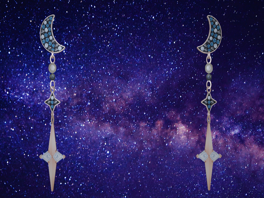 Pair of crescent moon pendant earrings adorned by two pearls and two stylized stars. The peals come in two colors, one star is furnished with sparkly little colorized diamonds, the bigger star is in metal and adorned by two diamonds. The moon acts as a stud to attach the earring to the ear.