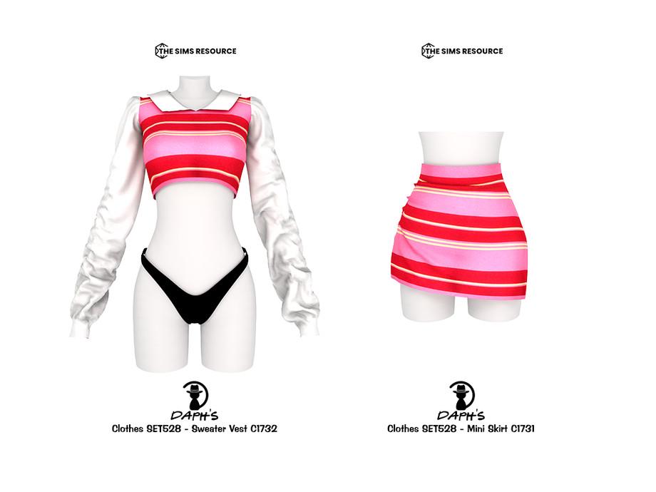 A cute and trendy outfit set featuring a striped sweater vest paired with a matching mini skirt. Designed with soft pastel tones and playful patterns, this set brings a perfect mix of cozy and flirty style to The Sims 4.