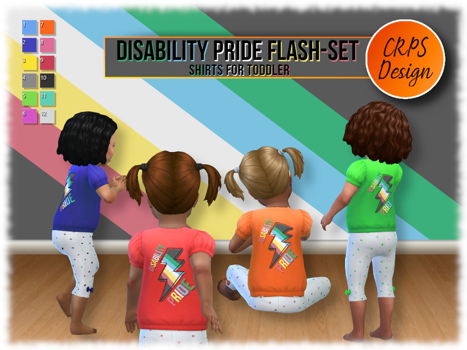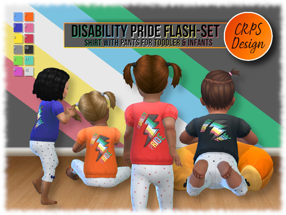 This set contains a T-shirt with matching pants for toddlers and infants. The shirt is printed with a Flash and the words Disability Pride. The pants are white with polka dots is in the same colors as the T-shirts.