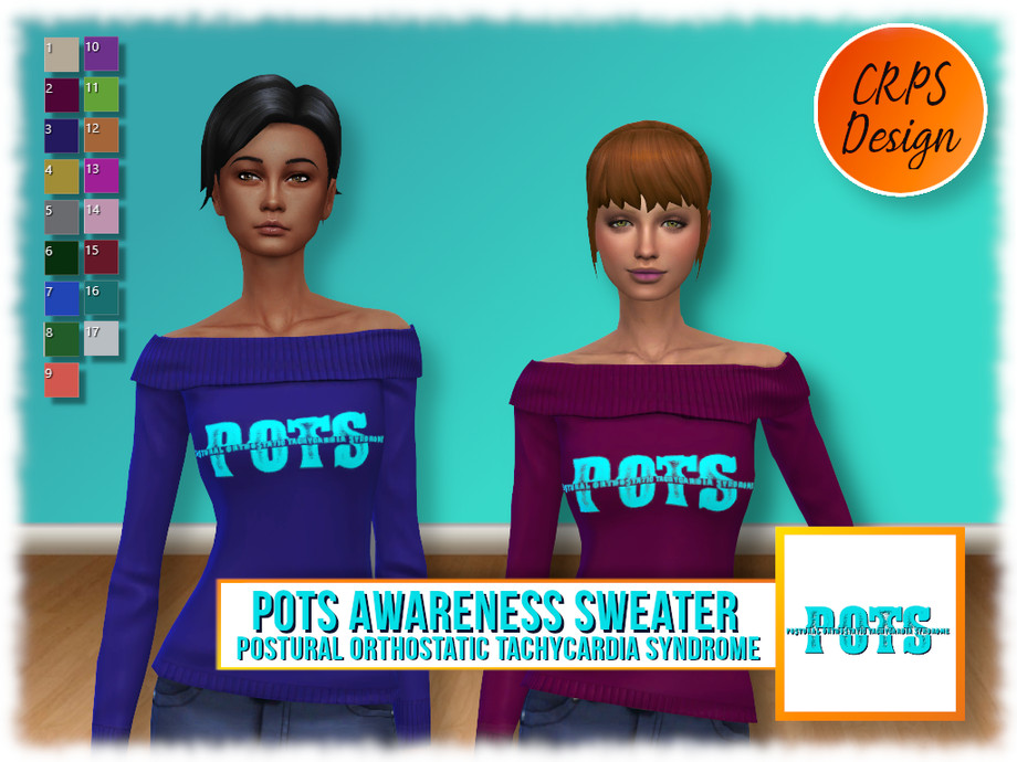 This set contains two POTS (Postural Orthostatic Tachycardia Syndrome) Awareness Sweaters. Both are available in 17 colours.