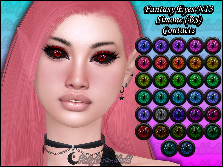 Cat inspired fantasy eyes with a little shimmer. Comes in a wide variety of colors. This version have a black sclera to give it a more dark and sinister look. Perfect for your dark and mysterious fantasy sims.