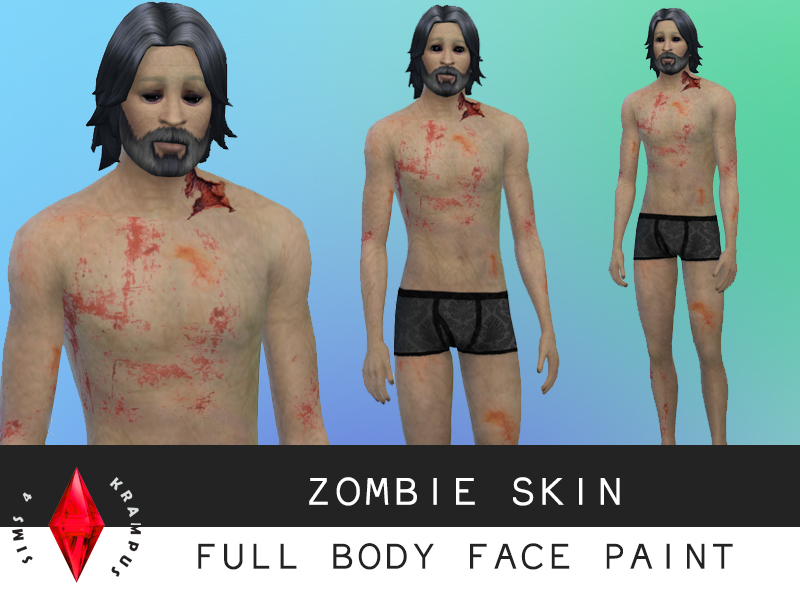 This is a face paint that covers the entire body. It was made a face paint so that it can be removed at any time. The whole body is covered in a vein-like zombie/corpse texture and also has light bruising, scratches, dark circles under the eyes, darkened lips, & a tear in the flesh.