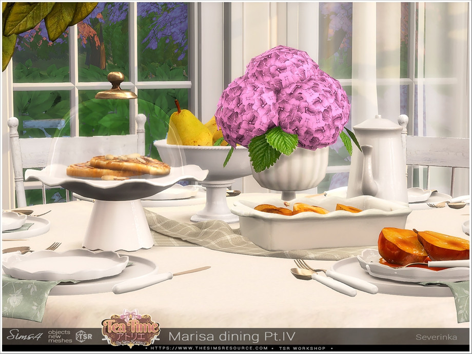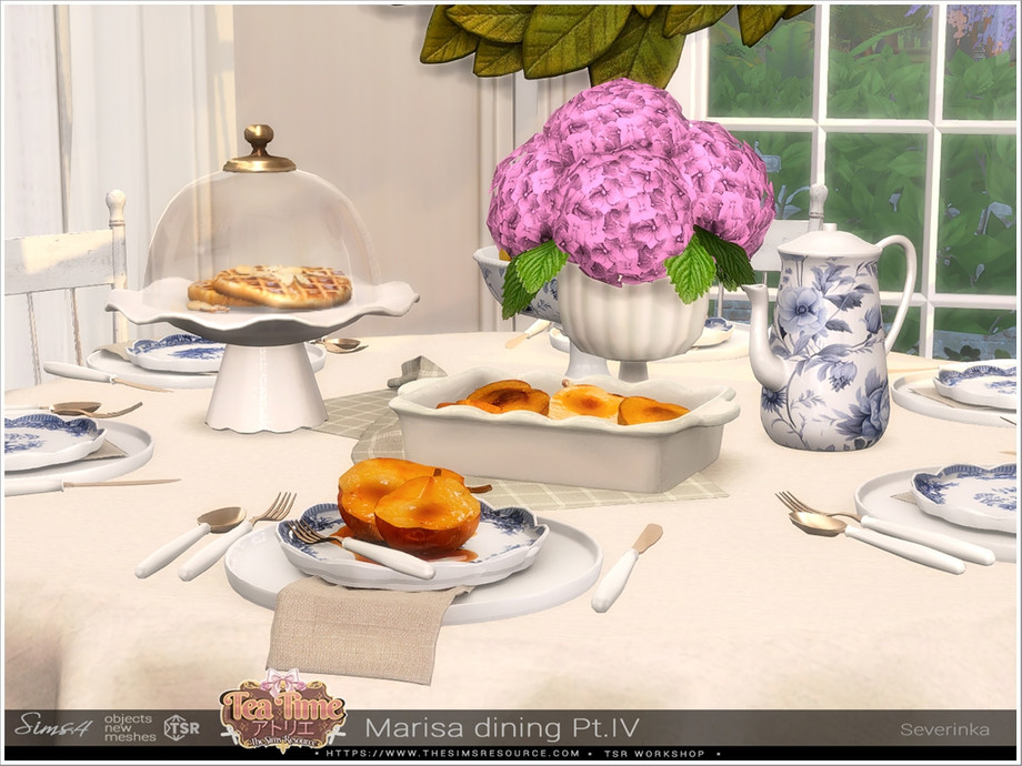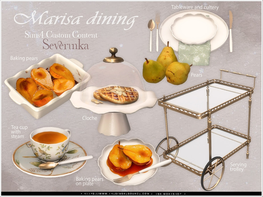 Delicate beige and deep shades of green combined with natural wood and aged gold will fit perfectly into the Farmhouse, Shabby, French Country or Vintage styles. Part 1 - 7 items: Buffet, dining table, dining table round, dining chair, wall art, wall wood pediment, tablecloth. Part 2 - 7 items: Casserole big, casserole small, decorative plates, decorative plates oval, stacks of plates, vase for fruits, basket with dishes. Part 3 - 8 items: Bowl, bowls, teapot, egg stands, tea pair empty, cups on plates, 2 vase for cakes. Part 4 - 8 items: Serving trolley, cloche, tea pair full, baking pears, baking pears for plate, pears, tableware, cultery.