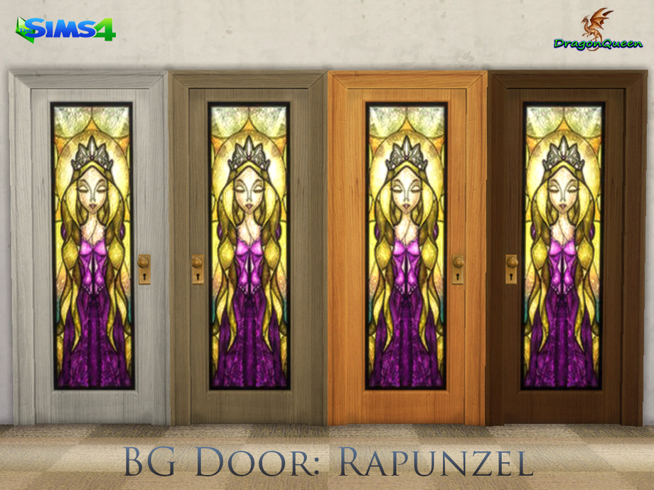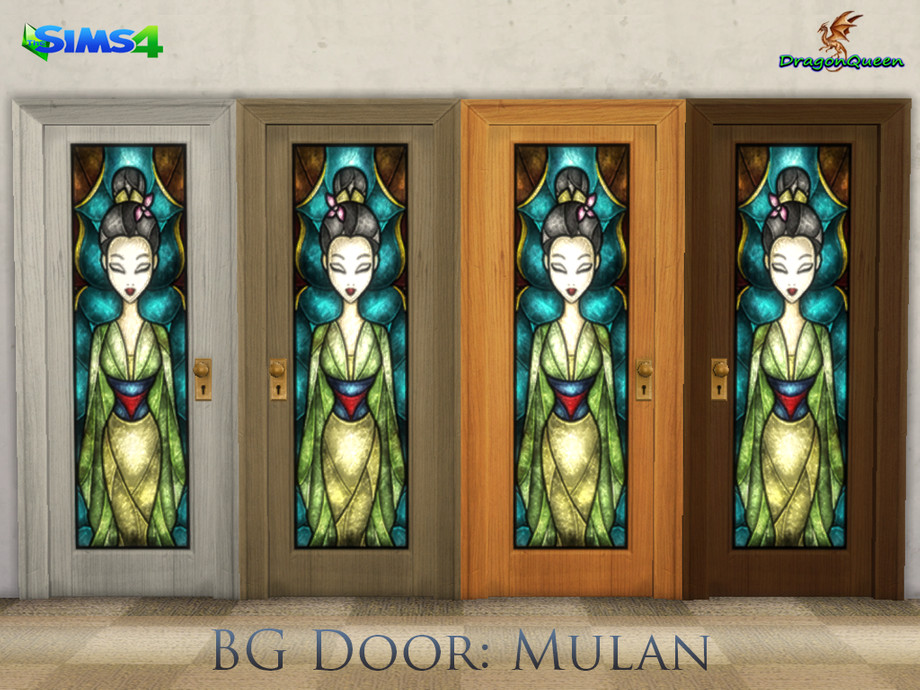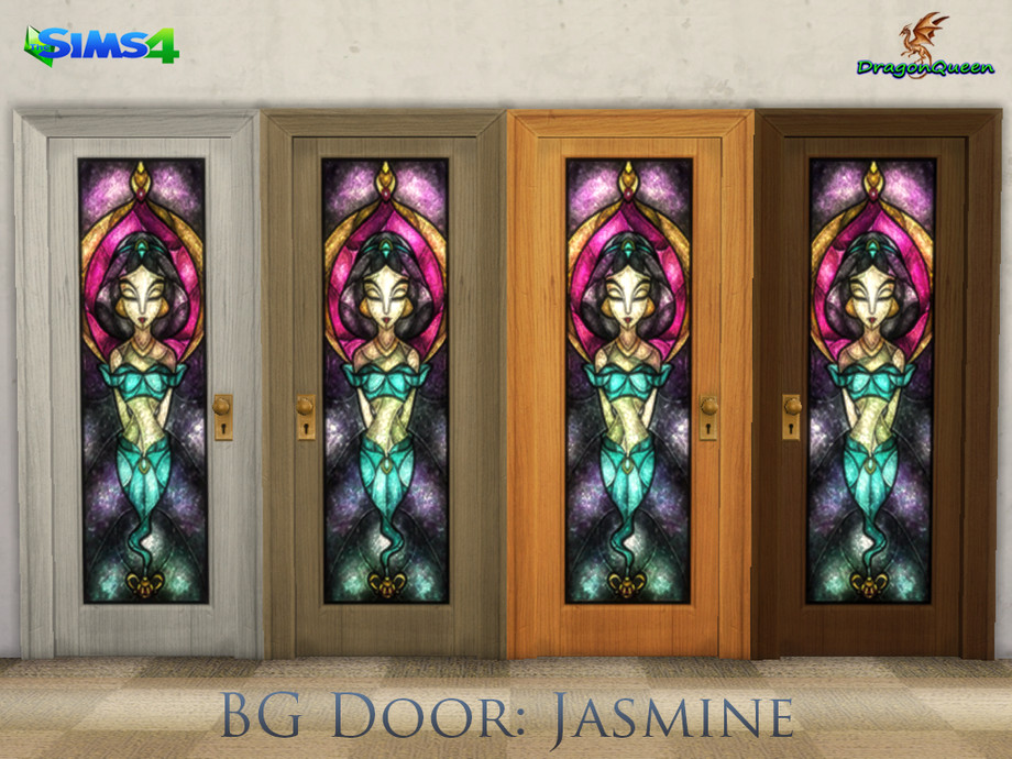 A set of wood doors, in four frame colors, with stained glass insert of Jasmine, Mulan and Rapunzel.