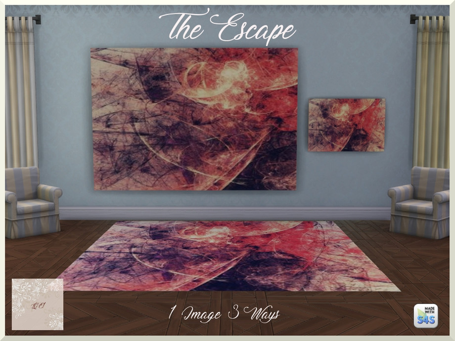 Sims 4 — The Escape by QueenElizabethI — A compilation of a mural, landscape painting, and a rug. The image is an