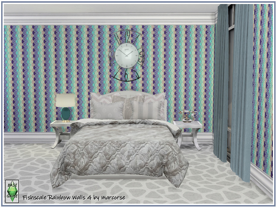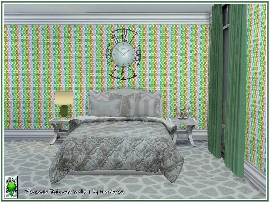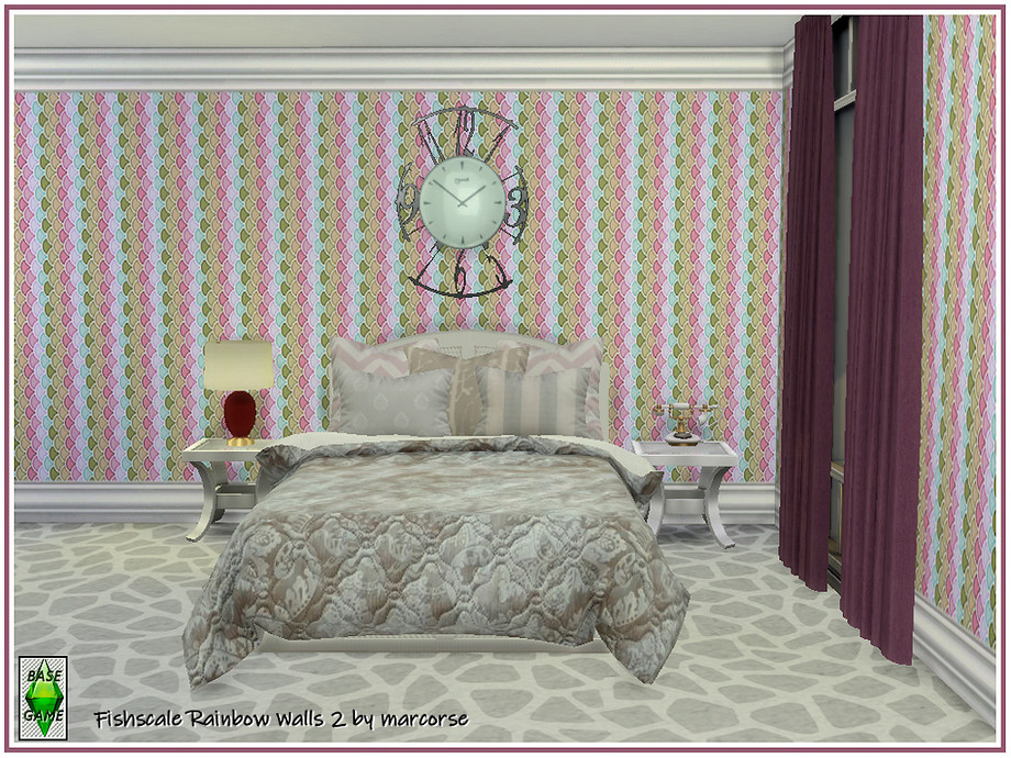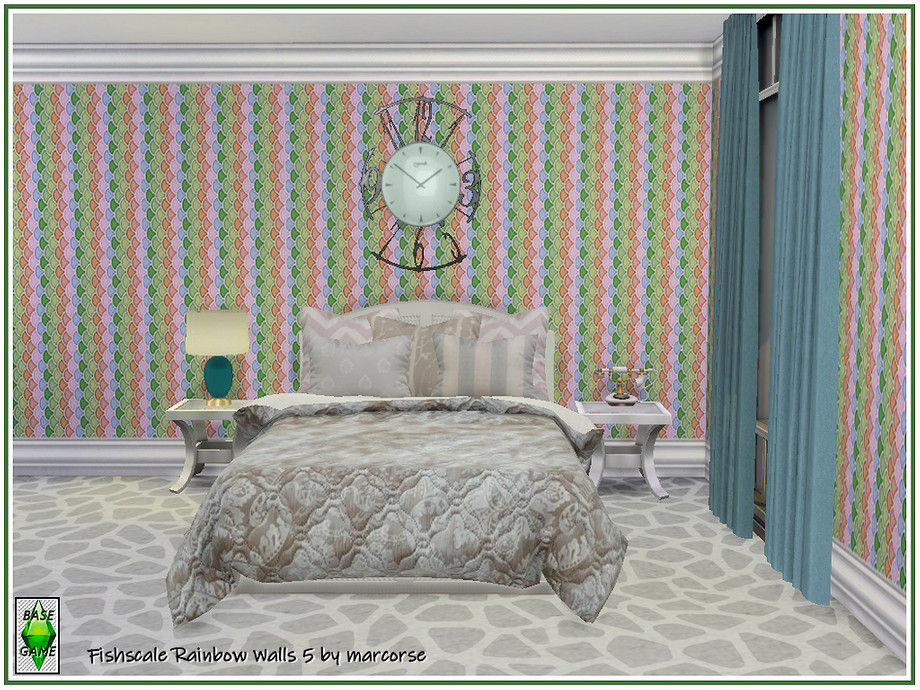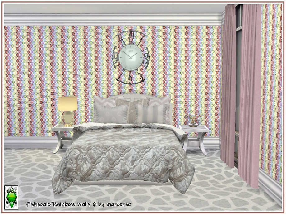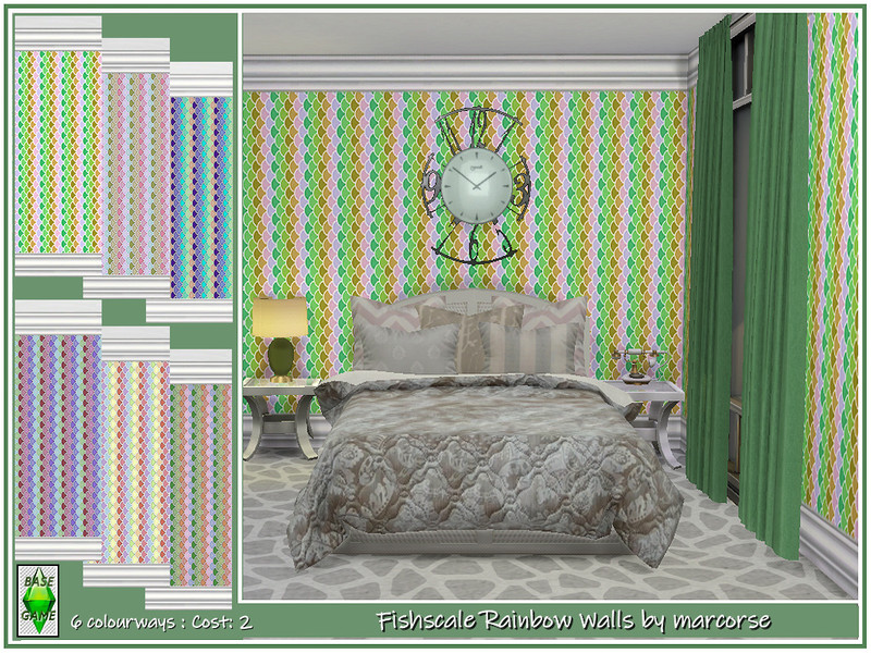 Vertically striped, brightly coloured wall, featuring a scalloped design somewhat resembling fish scales. Full wall treatment with white cornice and skirting trims. 6 Colourways. Found in Wallpaper. Cost : 2.