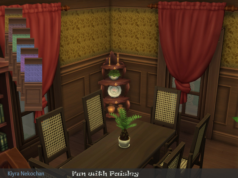 A panel wall with a paisley pattern. 12 colors - 6 with brown wood paneling and 6 with white wood paneling. Each with a custom thumbnail.