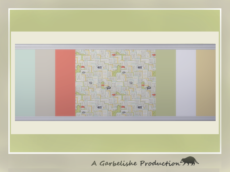 A seamless wall mural with Godzilla wreaking havoc. Plus 6 paint swatches.