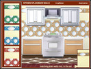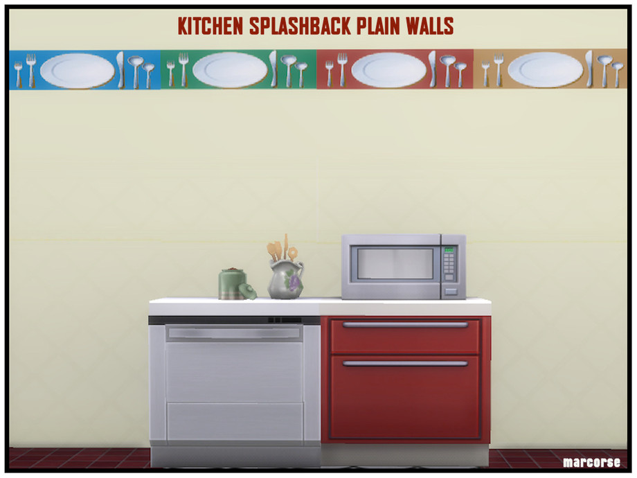 Four kitchen splashback walls with matching plain wall. 4 colourways - blue,green, mustard and red. Found in Wallpaper. Created in the base game.