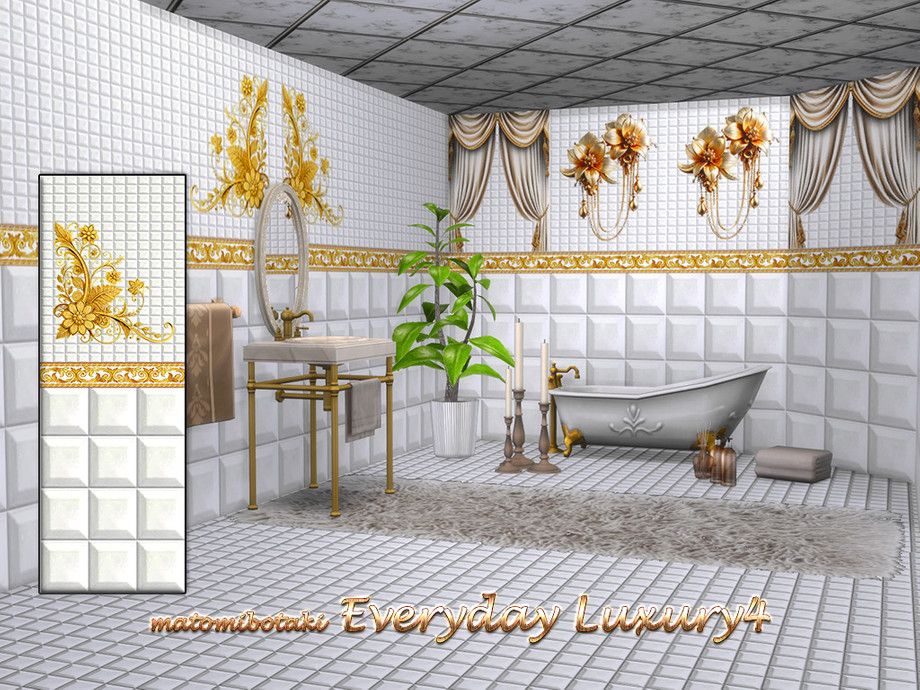 Treat yourself to a little luxury every day when you use your bathroom and enjoy elegant and sophisticated tiles, with 5 different, combinable tile designs in 3 wall heights and each item with custom thumbnail, created for Sims 4 by matomibotaki.