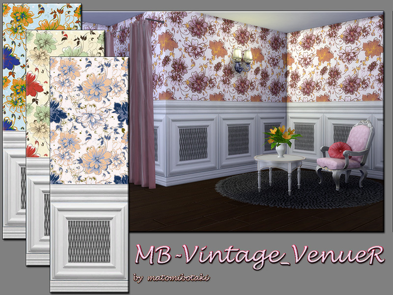 MB-VintageVenueR, wallpaper with floral design, lower wooden part with wicker inlay in white, comes in 4 different colors and 3 wall-hights, with custom thumbnail, created for Sims 4, by matomibotaki