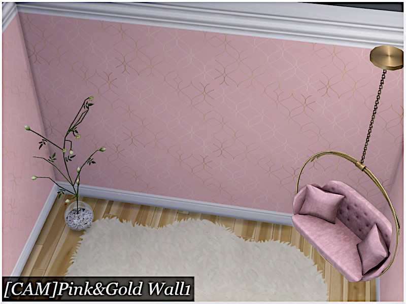 An abstract patterned wall in pink and gold, with white trim.
