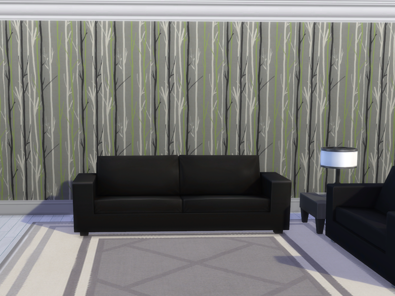 Tifton Wall01- Branch wallpaper in 4 color options, each color with and without white baseboard and crown molding trim.
