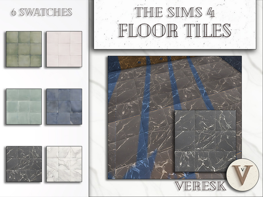 Marble wall tiles for use in The Sims 4, for walls and floors. There are six repaint options: two shades of white, one shade of blue, one shade of black and two shades of green.