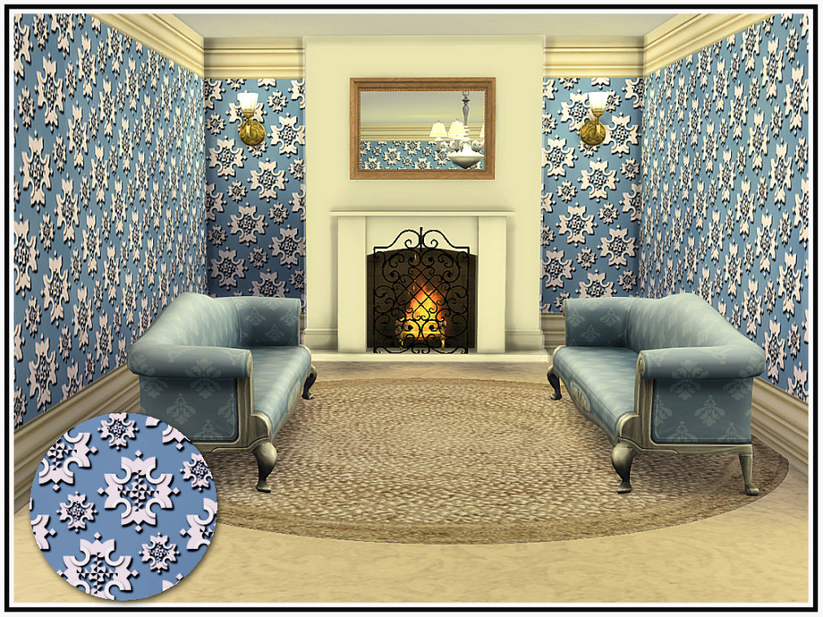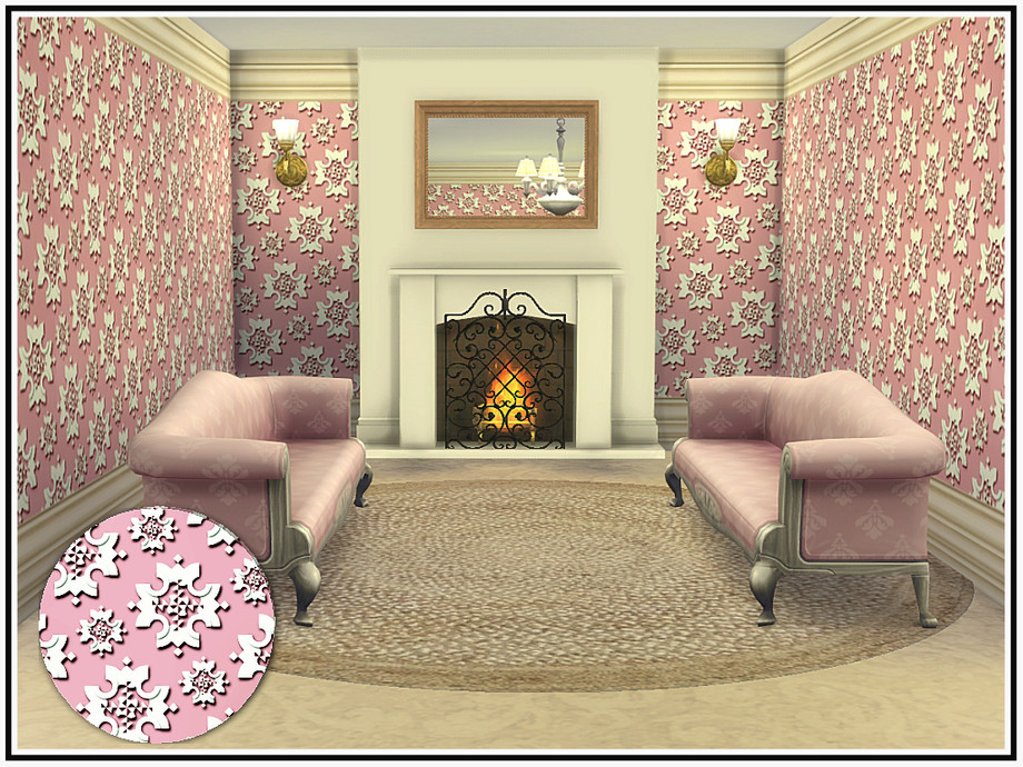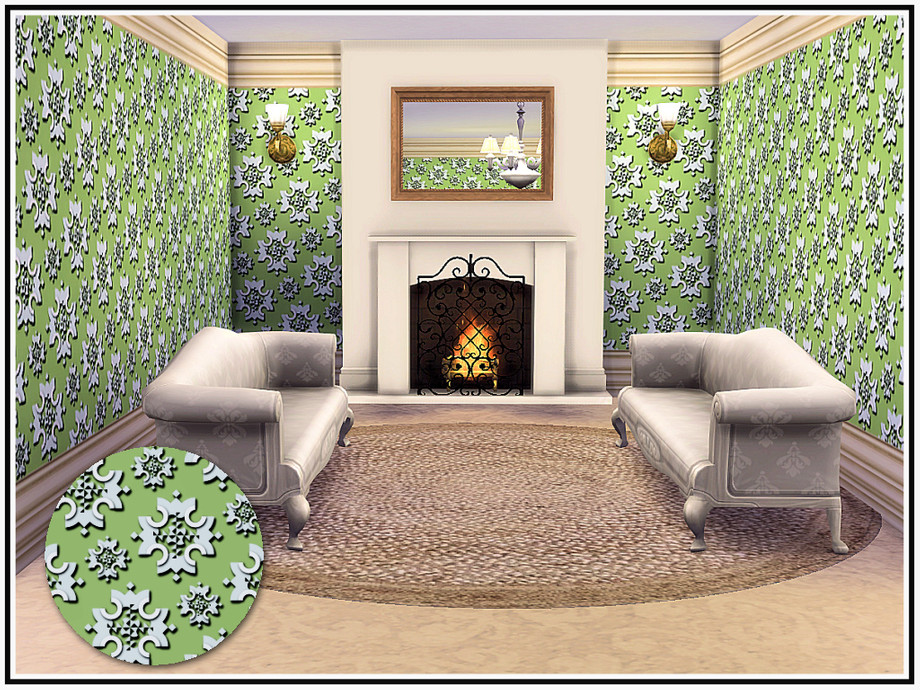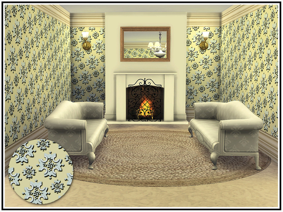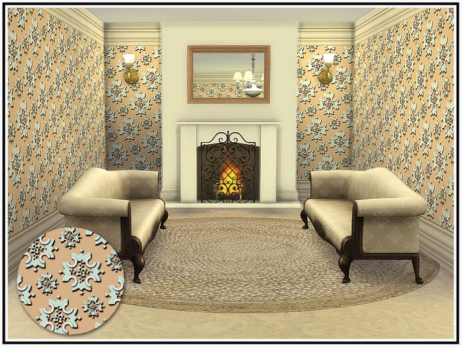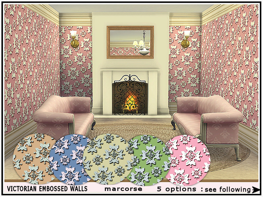 Embossed floral medallions in a late-Victorian style wall, with deep cornice and skirting trims. 5 colourways. Found in Wallpaper. Created in the base game for everyone.