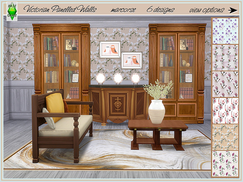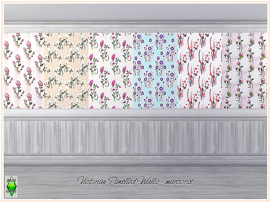 A further collection of Victorian floral designs on panelled walls. 6 colourways. Found in Panelling. 3 wall heights. Price : 4.