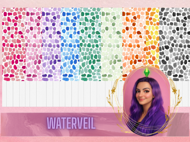 This wall set combines soft watercolor patterns with classic paneled textures, creating a calm and elegant look for your Sims homes