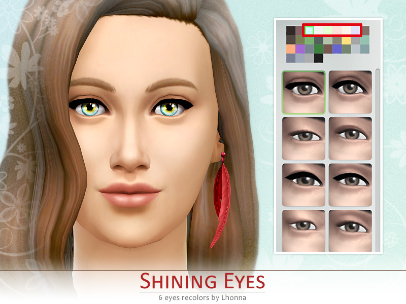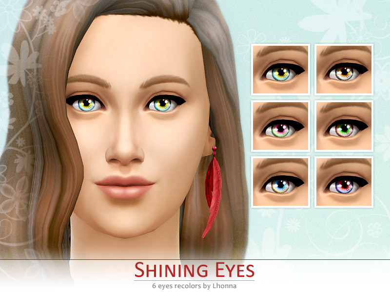 Non-default eyes recolors for yours Sims. Shining Eyes comes in 6 colors: light blue, grey, light green, light amber, light grey, light purple and can be found in eye color section.