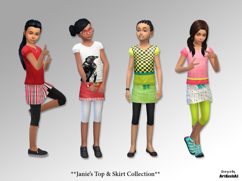Included are four tops and four skirts, in bright and fun colors for your little girl Sims! All of these can be mix and matched if you would like. Please do not claim my designs as your own, alter them or upload them anywhere else. Thank you!