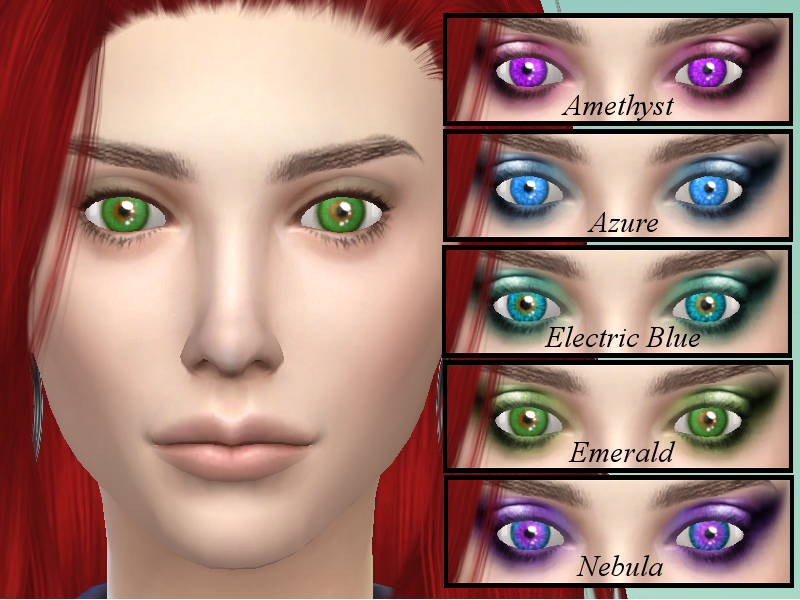 My fist ever custom creations for The Sims 4! This set comprises five different eye colours: Amethyst (light, vivid purple), Azure (bright blue), Electric Blue (bright blue with an inner green ring), Emerald (bright green with an inner brown ring) and Nebula (blue with an inner ring of purple). These eyes may all be found in the Eyes section.
