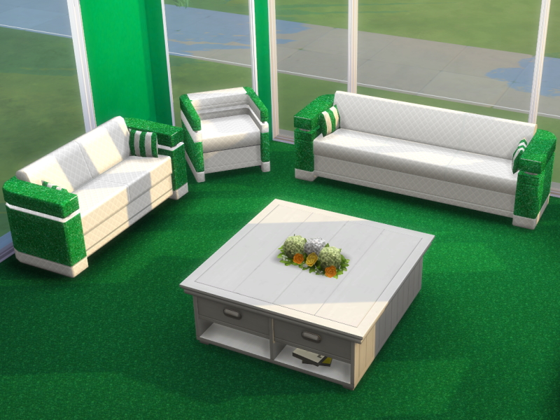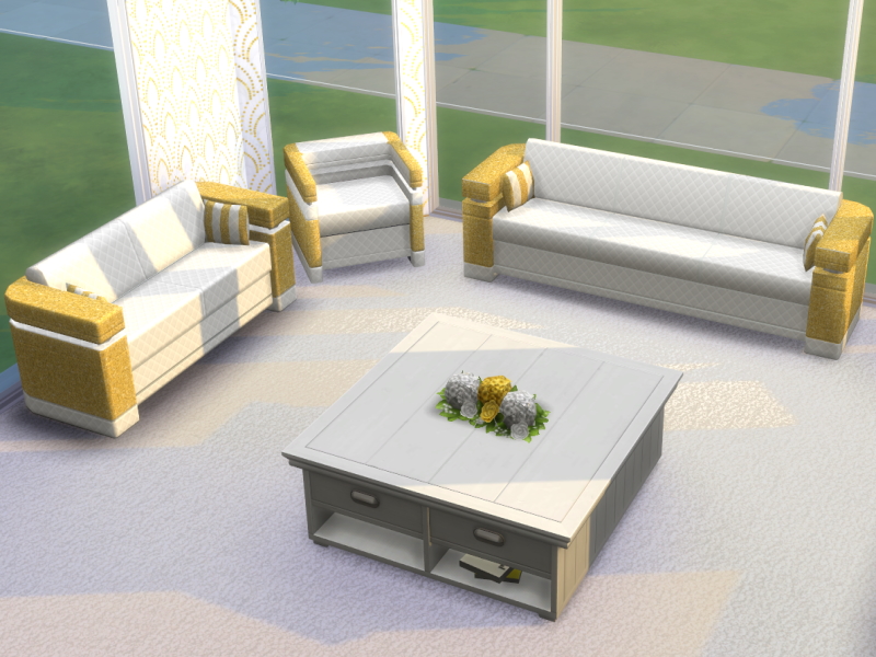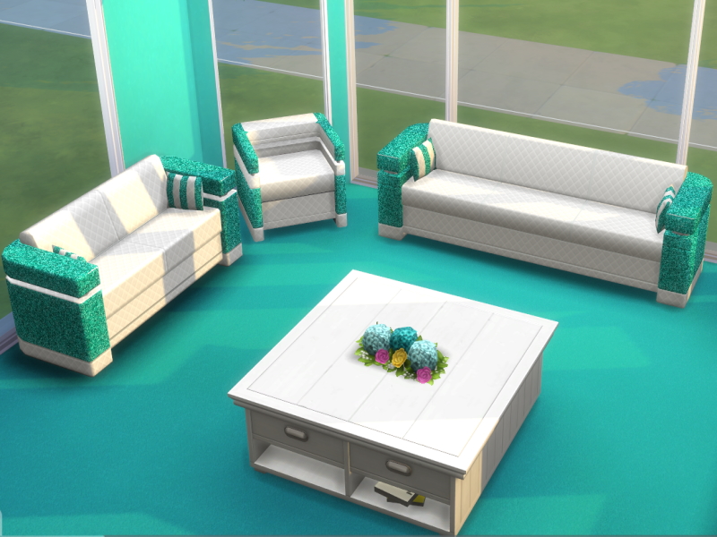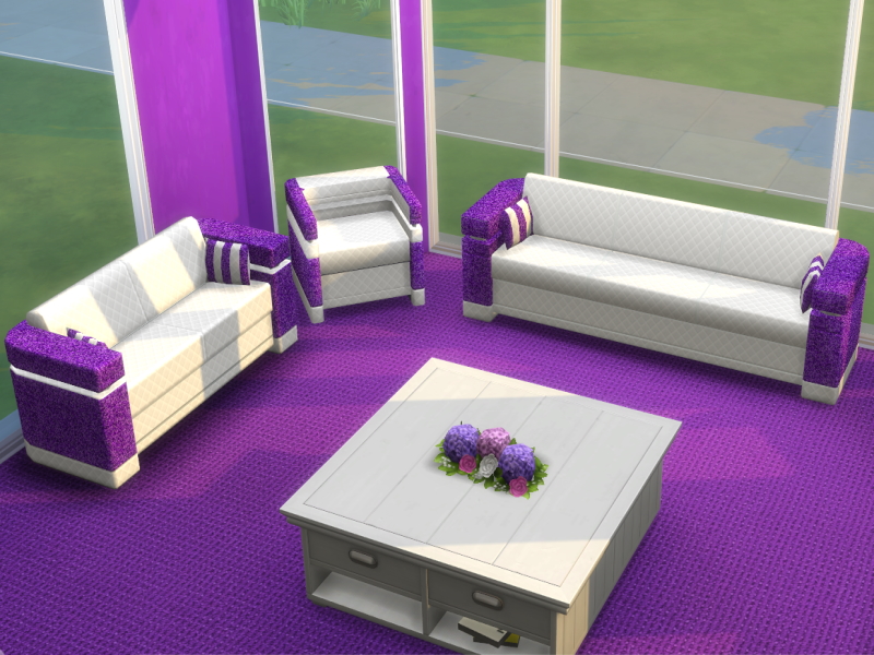 The Glittery Living Room Set comes in 6 colours, all with plush quilted white cushions for maximum comfort. These are recolours of base game onjects.