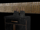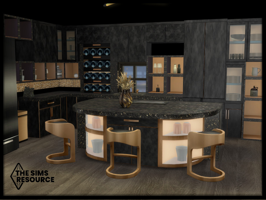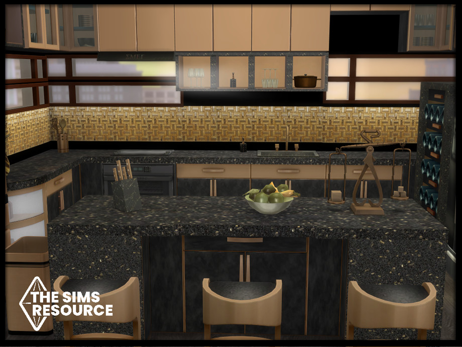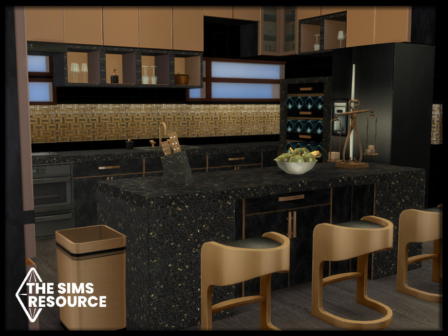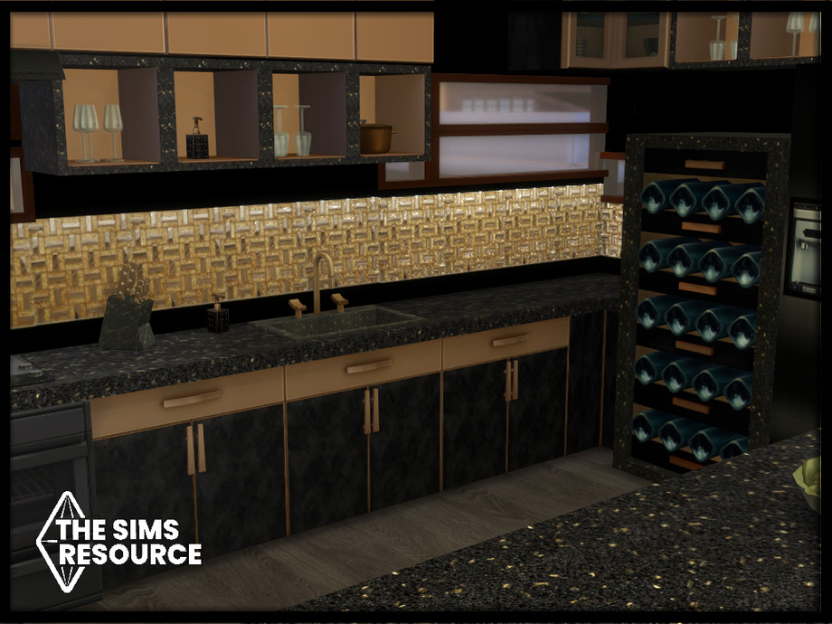 Maxis match black and gold kitchen set made with black granite, marble and gold metal. Doors are finished in a high lacquered gloss.