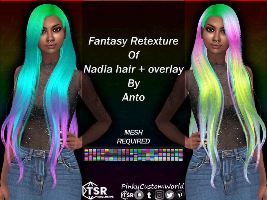 Beautiful very long alpha hairstyle originally made by Anto, with a extra color overlay found in hats, both recolored in a wide variety of unnatural gradient hair colors, so you can mix and match to get many different styles and color combinations.
