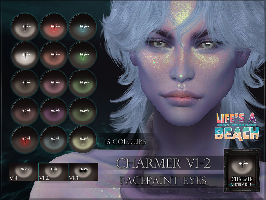 Charmer, facepaint eyes in 15-16 colours, with and without pupils, with light and dark sclera, for occult sims like sirens and mermaids sims.